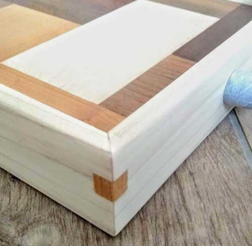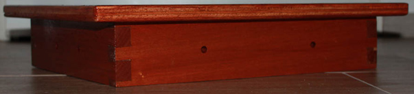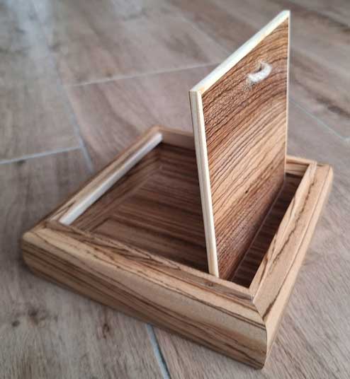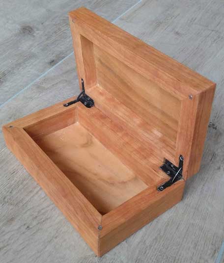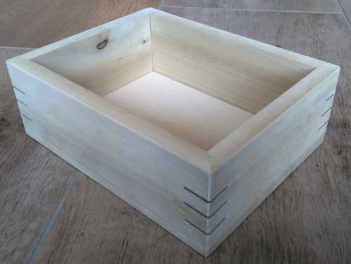 Bakje van tulpenhout in verstek. In de hoeken zijn 'veren' van wengé ingelijmd. Dit zorgt voor versteviging maar is ook zeer decoratief
