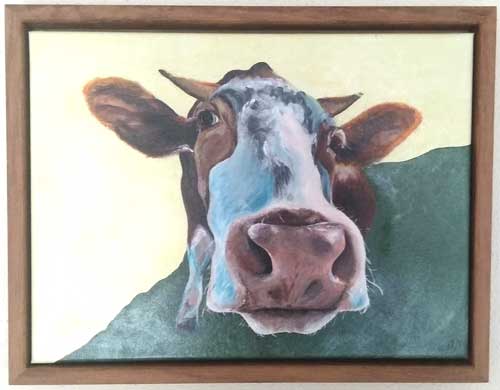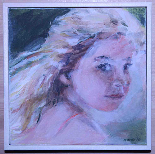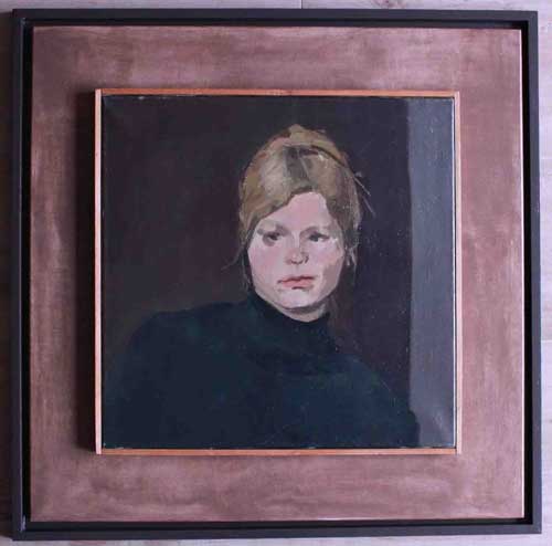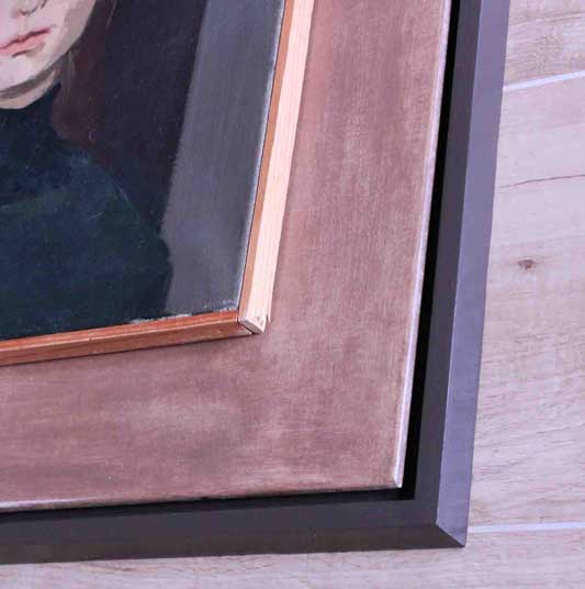 De opdracht was bij deze lijst om de oorspronkelijke latten om het schilderij te laten zitten. Nu is het een schilderij op een lijst, in een lijst geworden. Door de kleurkeuze komt het portret goed naar voren.