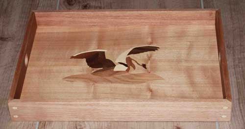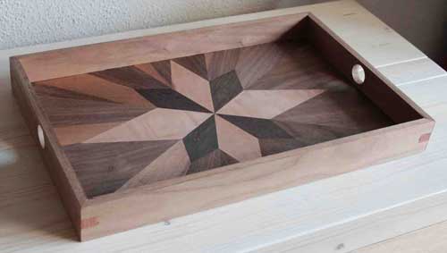 Notenhouten dienblad. Ingelegd fineer met noten, esdoorn en gerookt eiken.