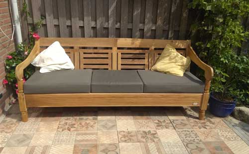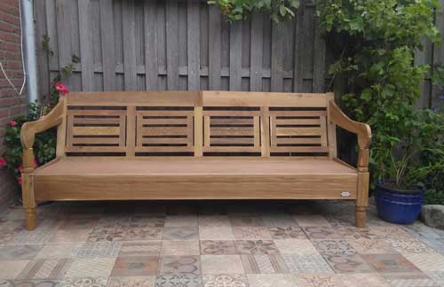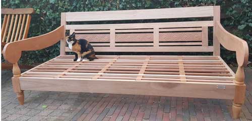 Loungebank van Meranti. De voorste poten zijn gedraaid door J.J. de Bruin.