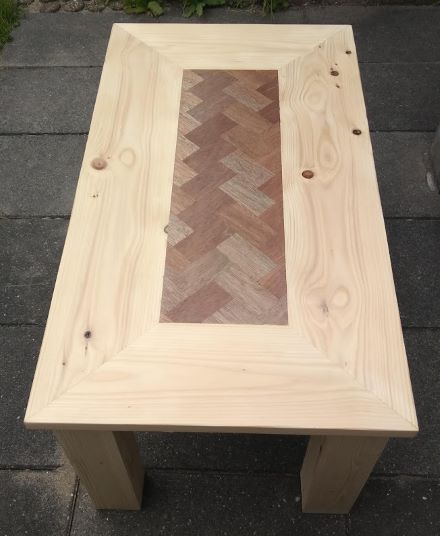 Tuintafel. Steigerhout met visgraatblad van Meranti