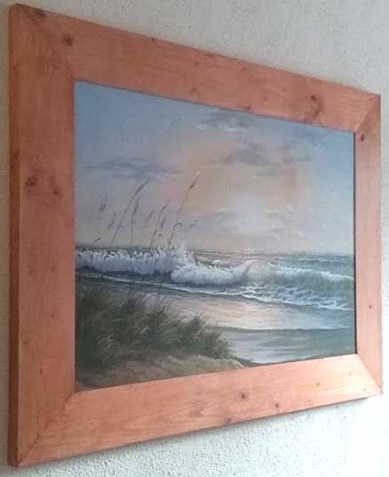 Schilderijlijst van vurenhout. Met beits heeft hij een teak uitstraling gekregen