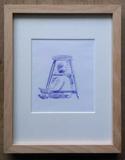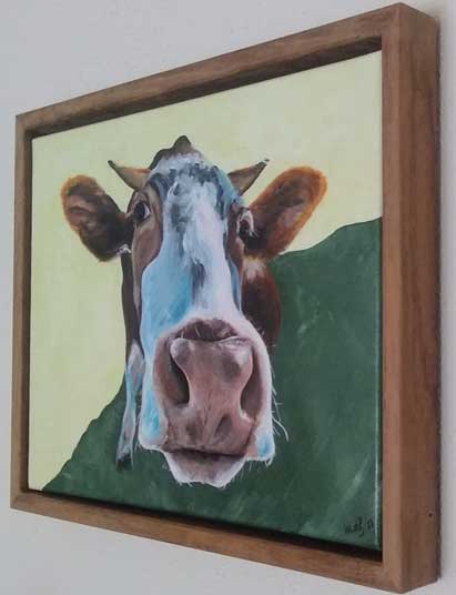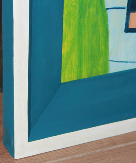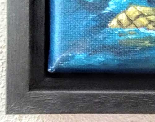 Bij dit schilderij is voor een brede vurenhouten lijst gekozen. De rand valt een heel klein beetje over het doek om dit mooier af te werken.