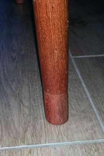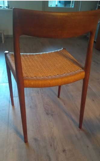 Prachtig Mahonie houten stoeltje Deens design. Doordat de zitting vrij ver achterover helt zat hij voor het gevoel nogal laag bij de eettafel. Oplossing: De pootjes met 4 cm verlengd.