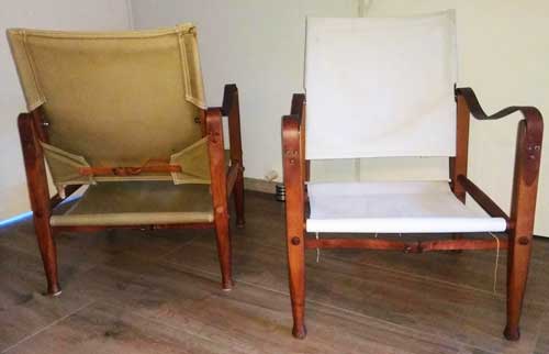 Safaristoeltjes. Armleuning en voor- en achterregels (beiden van leer) vervangen. Doordat de stoeltjes demontabel zijn konden de stoeltjes meegenomen worden door de dragers zodat de rijke heren naar de olifanten konden kijken.