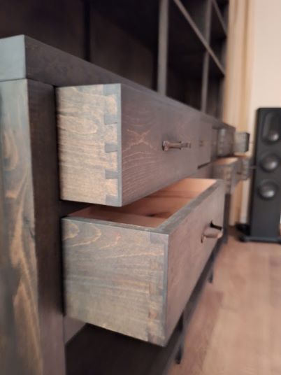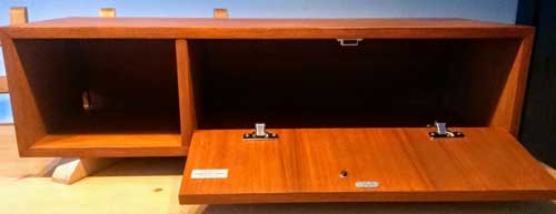 Teakhouten stereomeubel. Oorspronkelijke model bevatte 6 lades en een vak voor de stereoapparatuur. In het vak zijn 2 lades bijgemaakt.