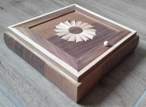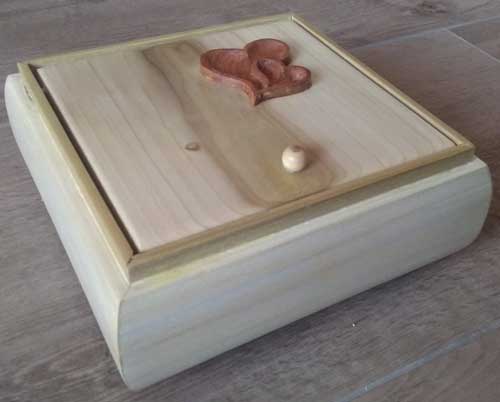 Sieraden kistje van massief tulpenhout. Intarsia in de deksel is van kersenhout. Hij is niet glad afgewerkt maar in reliëf omdat dit een cadeau was voor een blind persoon.