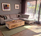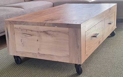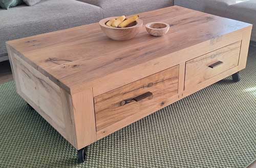 Salontafel gemaakt van oude eikenhouten herzaagde spoorbielzen