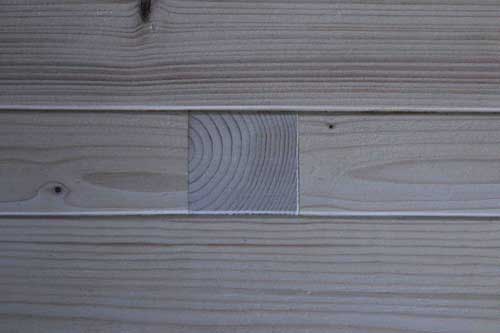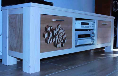 Bovenblad vah het tv meubel. Voor een speels effect is de kopse kant van hout verwerkt tussen de planken.