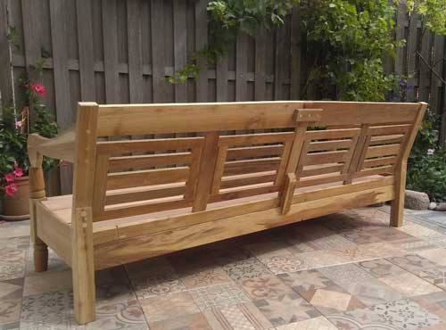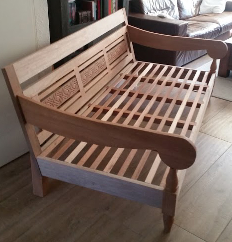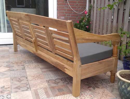 Loungebank van Meranti. De voorste poten zijn gedraaid door J.J. de Bruin.