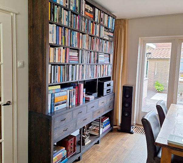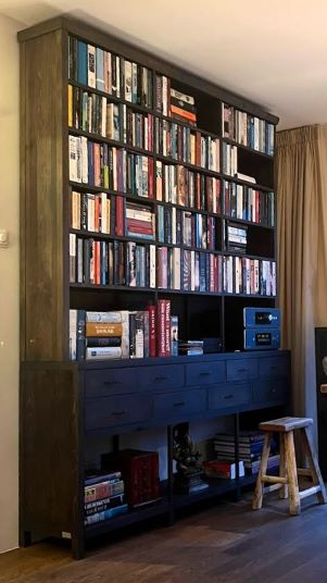 Bij een bestaande wandkast moest een extra kastje komen voor het wegwerken van bedrading e.d. (links op de foto)