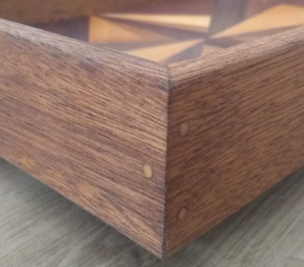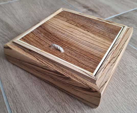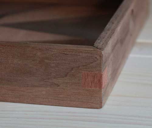 Bakje van tulpenhout in verstek. In de hoeken zijn 'veren' van wengé ingelijmd. Dit zorgt voor versteviging maar is ook zeer decoratief