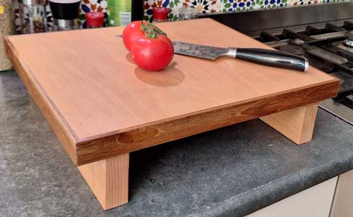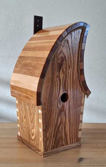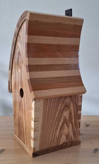 Essenhout, dakje van reststukken beuk en kers. Afgewerkt met jachtlak