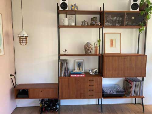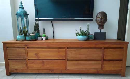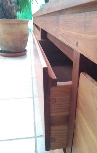 Teakhouten stereomeubel. Oorspronkelijke model bevatte 6 lades en een vak voor de stereoapparatuur. In het vak zijn 2 lades bijgemaakt.
