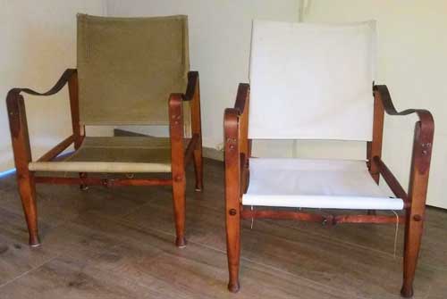 Safaristoeltjes. Armleuning en voor- en achterregels (beiden van leer) vervangen. Doordat de stoeltjes demontabel zijn konden de stoeltjes meegenomen worden door de dragers zodat de rijke heren naar de olifanten konden kijken.