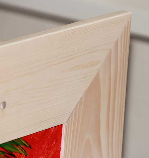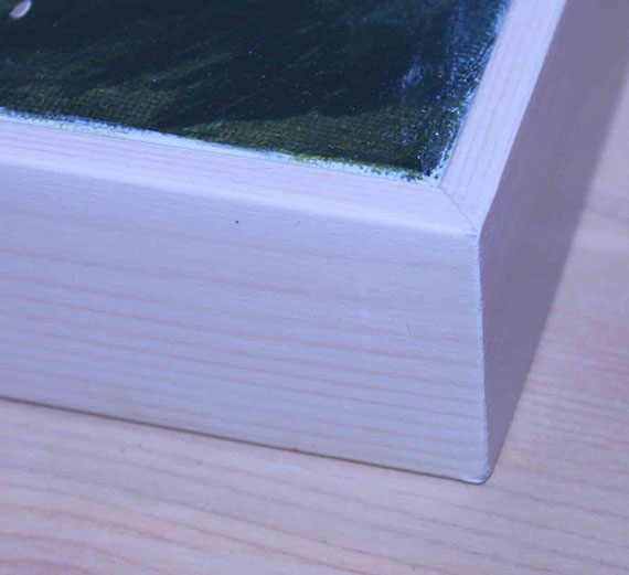 Bij dit schilderij is voor een brede vurenhouten lijst gekozen. De rand valt een heel klein beetje over het doek om dit mooier af te werken.