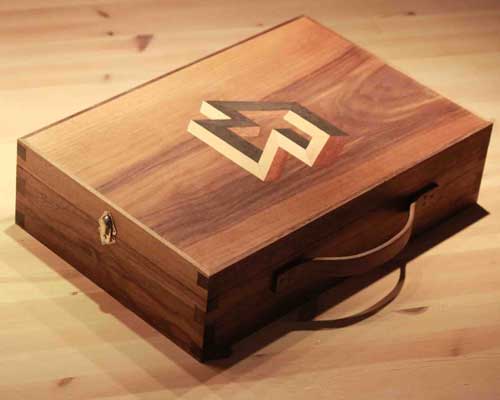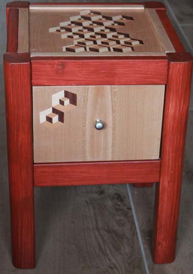 Sieraden kistje van massief tulpenhout. Intarsia in de deksel is van kersenhout. Hij is niet glad afgewerkt maar in reliëf omdat dit een cadeau was voor een blind persoon.