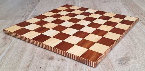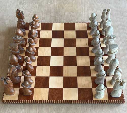 Samenwerkingsproject met Adriaan de Boer die de schaakstukken met de hand heeft gesneden uit meranti
