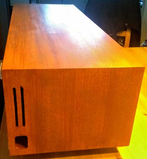 Achterzijde. De weinige aanwezige schroeven zijn verstopt onder houten proppen.